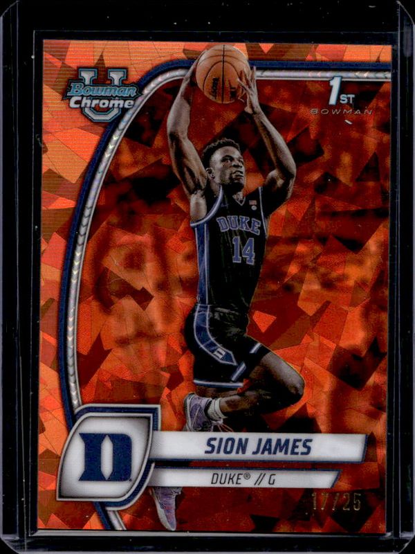 The Sion James 2024 Bowman Chrome University Sapphire Edition #63 Orange Refractor /25 card is 1 of 18 Sion James' card variations in the 2024 Bowman Chrome University Sapphire Edition set being tracked by Sports Card Investor, including Base, Purple Refractor /100, Yellow Refractor /75, Green Refractor /65, and Gold Refractor /50.