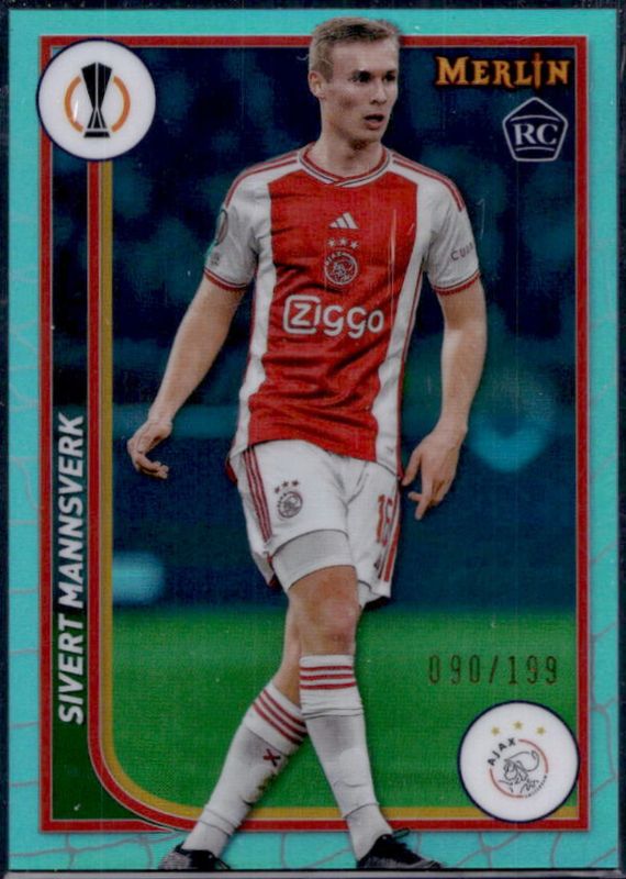 The Sivert Mannsverk 2023 Topps Merlin Chrome UEFA Club Competitions #7 Aqua Refractor /199 card is 1 of 44 Sivert Mannsverk's card variations in the 2023 Topps Merlin Chrome UEFA Club Competitions set being tracked by Sports Card Investor, including Base, Aqua Prism Refractor, Refractor, Vintage Merlin Refractor, and Neon Green Shimmer Refractor /399.