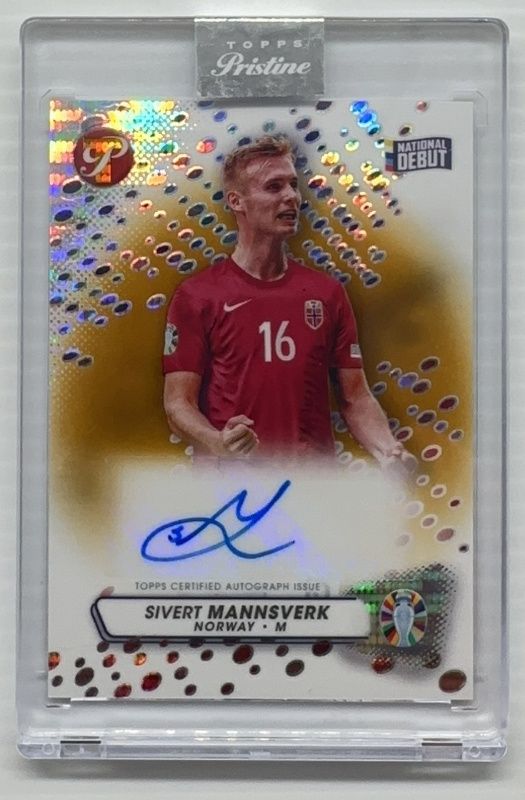 The Sivert Mannsverk 2024 Topps Pristine Road to UEFA Euro #PA-SM Pristine Autographs - Gold Pristine /50 card is 1 of 26 Sivert Mannsverk's card variations in the 2024 Topps Pristine Road to UEFA Euro set being tracked by Sports Card Investor, including Base, Pristine Refractor, Refractor, Green Refractor /125, and Purple Refractor /99.