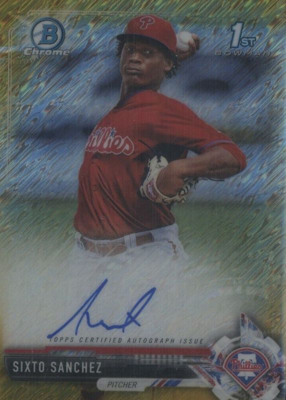 Best Prices Available For Sale of Sixto Sanchez 2017 Bowman Chrome #CPA-SS Prospect Auto - Gold Shimmer Refractor /50 (1st)