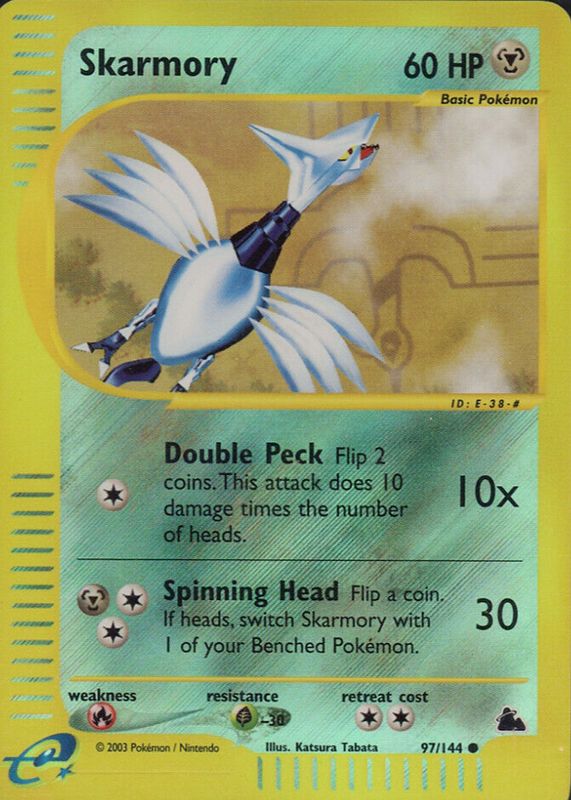 The Skarmory 2003 Skyridge #097/144 Reverse Holo card in Raw TCG (Near Mint) condition has not changed in price in the last 30 days and was last sold for $40.00 .
