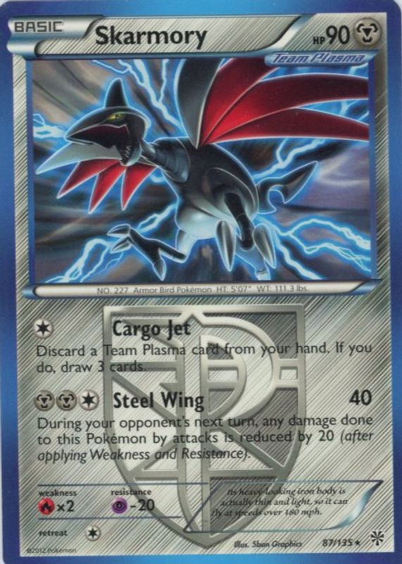 The Skarmory 2013 Black & White: Plasma Storm #087/135 Base card in Raw TCG (Near Mint) condition has not changed in price in the last 30 days and was last sold for $1.08 .