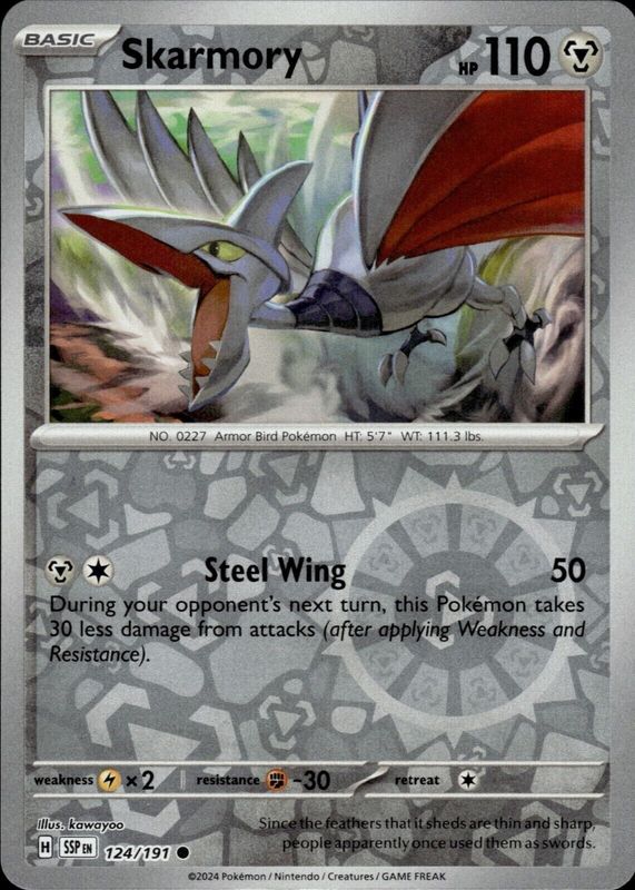 The Skarmory 2024 Scarlet & Violet: Surging Sparks #124/191 Reverse Holo card in Raw TCG (Lightly Played) condition has not changed in price in the last 30 days and was last sold for $0.99 .