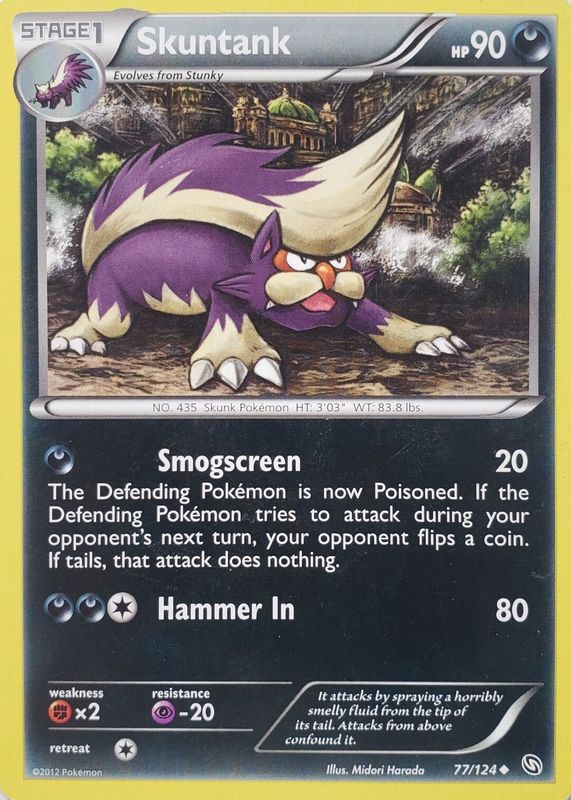 The Skuntank 2012 Black & White: Dragons Exalted #077/124 Base card in Raw TCG (Lightly Played) condition has moved down -$1.21 (-49.2%) in the last 30 days and was last sold for $1.25 .