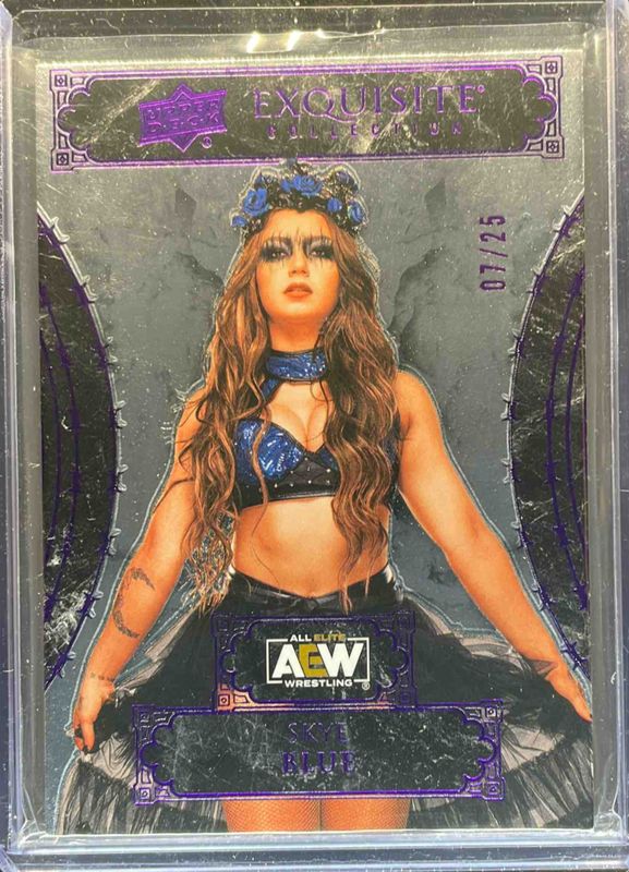 The Skye Blue 2024 Upper Deck AEW Black Diamond #7 Exquisite Collection - Purple /25 card is 1 of 28 Skye Blue's card variations in the 2024 Upper Deck AEW Black Diamond set being tracked by Sports Card Investor, including Base /149, Printing Plates /4, Autographs, Diamond Gallery, and Diamond Mine Relics.