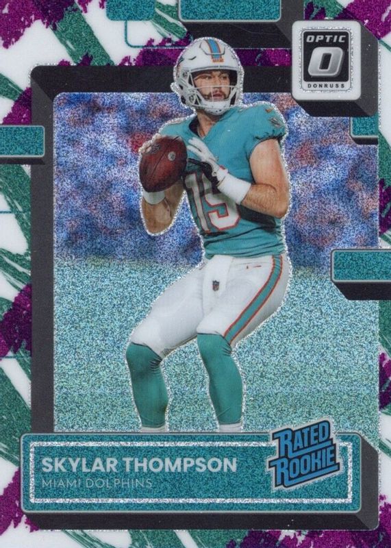 The Skylar Thompson 2022 Optic #276 Jazz /(SSP) Rookie card in Raw condition has not changed in price in the last 30 days and was last sold for $16.50 .
