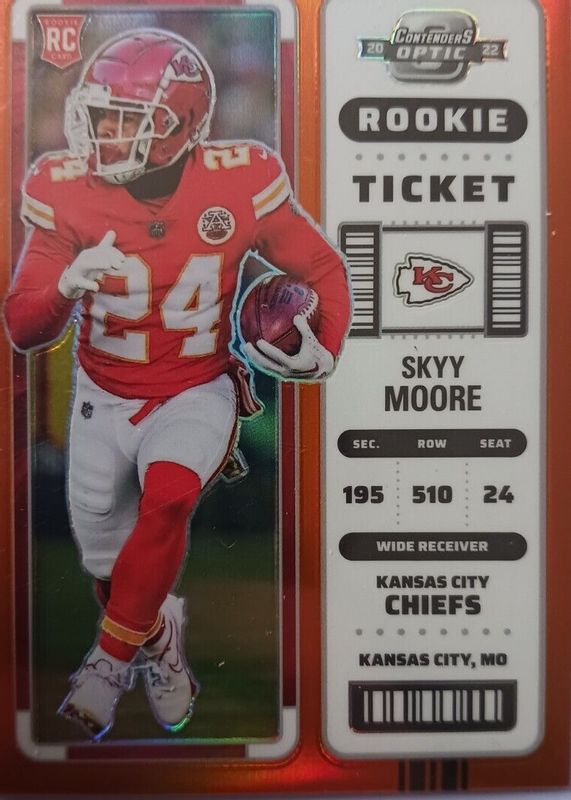 The Skyy Moore 2022 Contenders Optic #91 Orange /50 Rookie card in Raw condition has not changed in price in the last 30 days and was last sold for $0.99 .