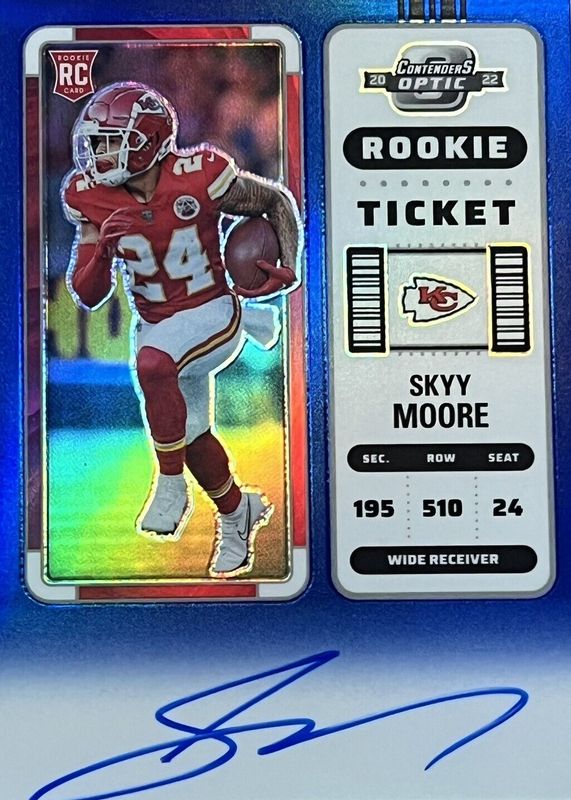 The Skyy Moore 2022 Contenders Optic #134 Rookie Ticket Auto - Blue /75 card in Raw condition has not changed in price in the last 30 days and was last sold for $15.00 .