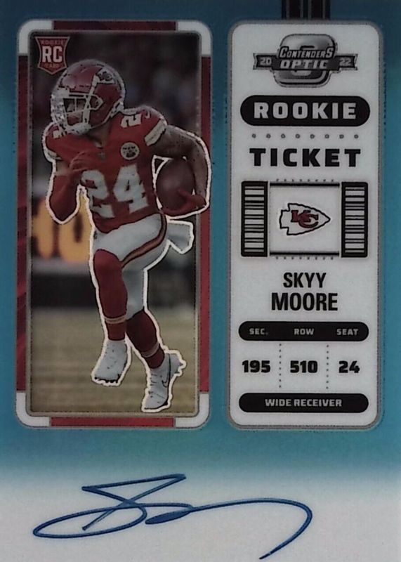 The Skyy Moore 2022 Contenders Optic #134 Rookie Ticket Auto - Teal /99 card in Raw condition has not changed in price in the last 30 days and was last sold for $30.00 .