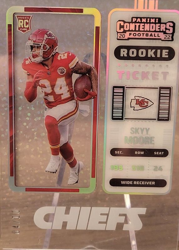 This card is 1 of 28 Skyy Moore's card variations in the 2022 Contenders set being tracked by Sports Card Investor, including Rookie Ticket Auto, Rookie Ticket Auto - Red Zone Ticket, Rookie Ticket Auto - Silver (/49), Rookie Ticket Auto - Ticket Stub (/24), and Rookie Ticket Auto - Wild Card.