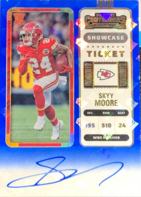 The Skyy Moore 2022 Contenders #134 Rookie Ticket Auto - Showcase /(SSP) card in Raw condition has not changed in price in the last 30 days and was last sold for $8.00 .