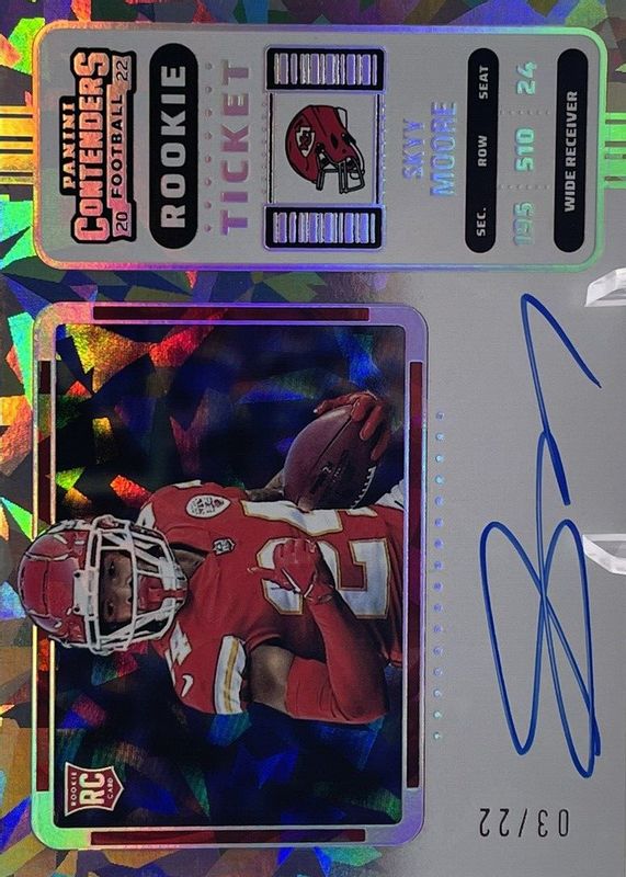 This card is 1 of 28 Skyy Moore's card variations in the 2022 Contenders set being tracked by Sports Card Investor, including Rookie Ticket Auto, Rookie Ticket Auto - Red Zone Ticket, Rookie Ticket Auto - Silver (/49), Rookie Ticket Auto - Ticket Stub (/24), and Rookie Ticket Auto - Wild Card.