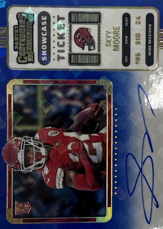 This card is 1 of 28 Skyy Moore's card variations in the 2022 Contenders set being tracked by Sports Card Investor, including Rookie Ticket Auto, Rookie Ticket Auto - Red Zone Ticket, Rookie Ticket Auto - Silver (/49), Rookie Ticket Auto - Ticket Stub (/24), and Rookie Ticket Auto - Wild Card.