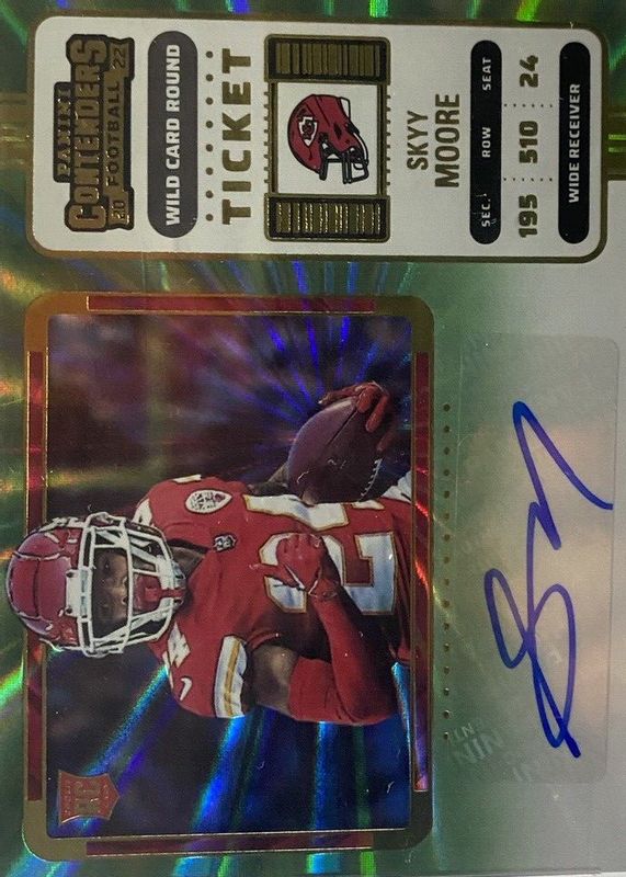 This card is 1 of 28 Skyy Moore's card variations in the 2022 Contenders set being tracked by Sports Card Investor, including Rookie Ticket Auto, Rookie Ticket Auto - Red Zone Ticket, Rookie Ticket Auto - Silver (/49), Rookie Ticket Auto - Ticket Stub (/24), and Rookie Ticket Auto - Playoff Ticket /99.