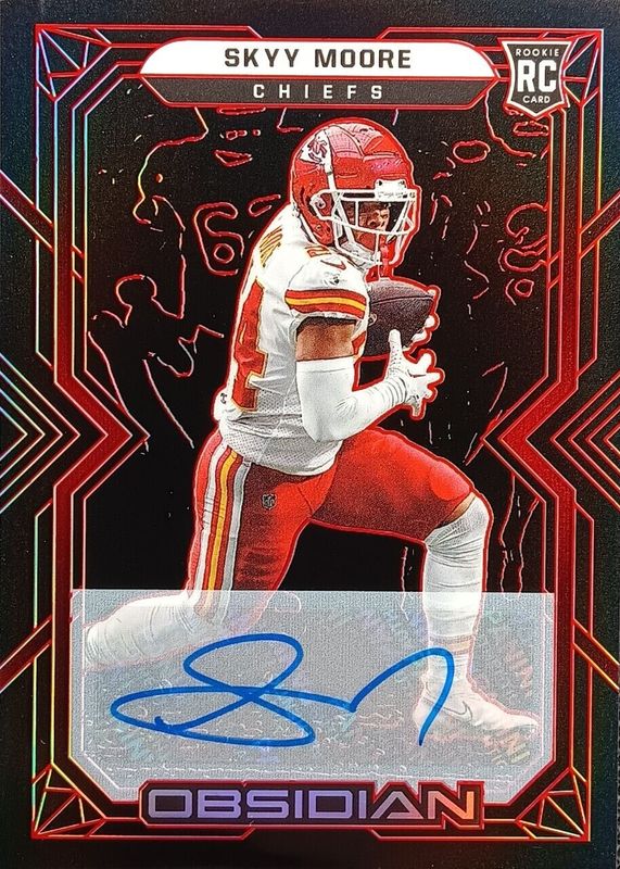 The Skyy Moore 2022 Obsidian #119 Rookie Autographs - Electric Etch Red /10 card in Raw condition has not changed in price in the last 30 days and was last sold for $8.50 .