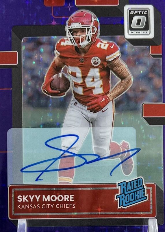 The Skyy Moore 2022 Optic #224 Rated Rookie Autographs - Purple Stars (/50) card in Raw condition has not changed in price in the last 30 days and was last sold for $10.00 .