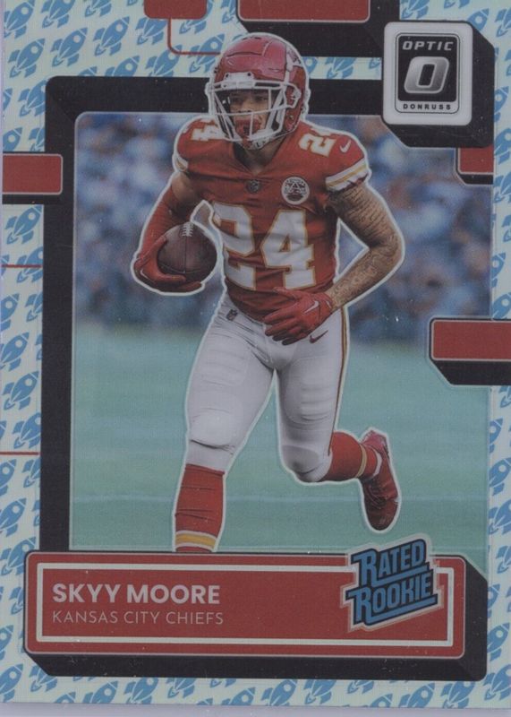 The Skyy Moore 2022 Optic #224 Rocket /(SSP) Rookie card in Raw condition has not changed in price in the last 30 days and was last sold for $2.84 .