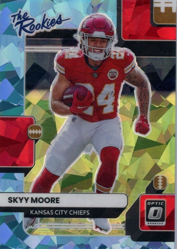 The Skyy Moore 2022 Optic #TR-16 The Rookies - Ice /15 card in Raw condition has not changed in price in the last 30 days and was last sold for $25.00 .