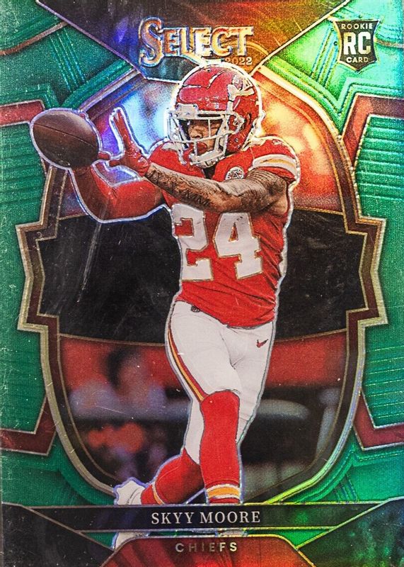 The Skyy Moore 2022 Select #21 Concourse Green /5 Rookie card in Raw condition has not changed in price in the last 30 days and was last sold for $29.88 .