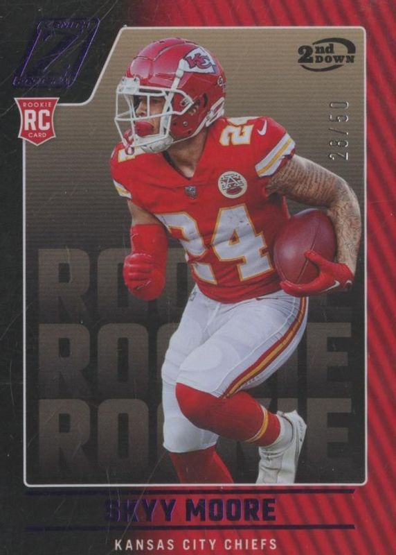The Skyy Moore 2022 Zenith #124 2nd Down /50 Rookie card in Raw condition has not changed in price in the last 30 days and was last sold for $2.25 .