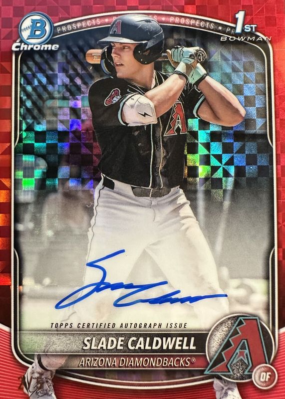 Auctions Ending Soon for Slade Caldwell 2025 Bowman #CPA-SC Chrome Prospect Auto - Red X-Fractor /5 (1st) RAW