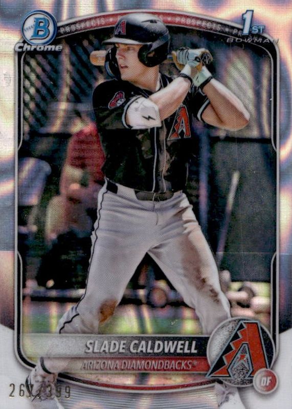The Slade Caldwell 2025 Bowman #BCP-21 Chrome Prospects - Lava Refractor /399 (1st) card in Raw condition has moved up $3.73 (+211%) in the last 30 days and was last sold for $5.50 .