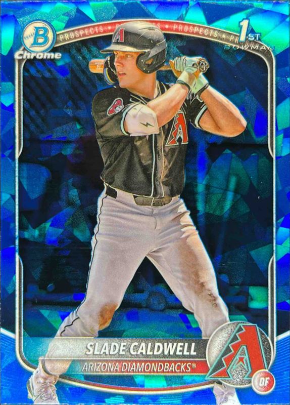 The Slade Caldwell 2025 Bowman Sapphire Edition #BCP-21 Chrome Prospects card is 1 of 21 Slade Caldwell's card variations in the 2025 Bowman Sapphire Edition set being tracked by Sports Card Investor, including Sapphire Selections, Chrome Prospect Autographs /199, Chrome Prospect Autographs - Green Refractor /99, Chrome Prospects - Green Refractor /99, and Chrome Prospects - Yellow Refractor /75.
