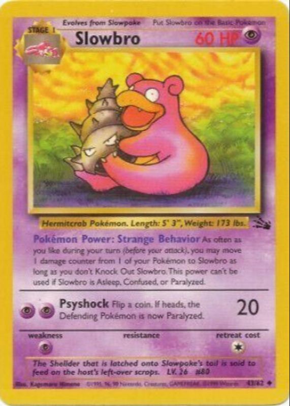 The Slowbro 1999 Fossil #43/62 Unlimited card in Raw TCG (Near Mint) condition has moved down -$2.72 (-68.0%) in the last 30 days and was last sold for $1.28 .