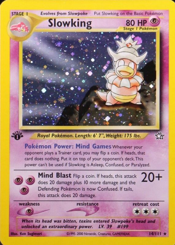 The Slowking 2000 Neo Genesis #14/111 1st Edition Holo card in Raw TCG (Near Mint) condition has moved down -$214 (-56.9%) in the last 30 days and was last sold for $161.49 .