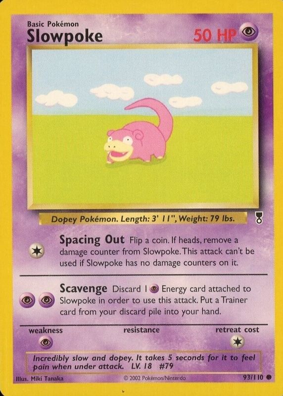 The Slowpoke 2002 Legendary Collection #93 Base card in Raw TCG (Near Mint) condition has moved down -$5.82 (-66.8%) in the last 30 days and was last sold for $2.89 .