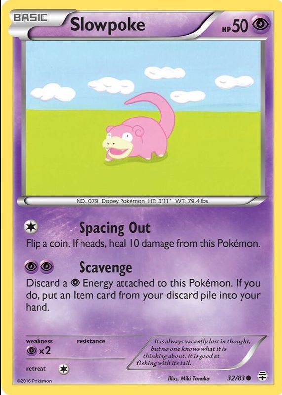 The Slowpoke 2016 XY: Generations #32/83 Base card in Raw TCG (Lightly Played) condition has not changed in price in the last 30 days and was last sold for $2.90 .