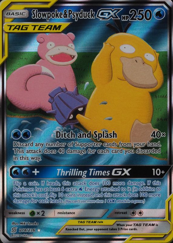 The Slowpoke & Psyduck GX 2019 Sun & Moon: Unified Minds #218/236 Holo (Alternate Full Art) card in Raw TCG (Near Mint) condition has moved down -$86.71 (-31.6%) in the last 30 days and was last sold for $187.29 .