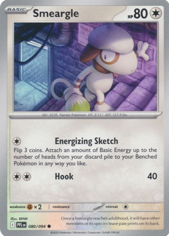 The Smeargle 2025 Mega Evolution: Phantasmal Flames #80/94 Base card in Raw TCG (Near Mint) condition has not changed in price in the last 30 days and was last sold for $0.99 .