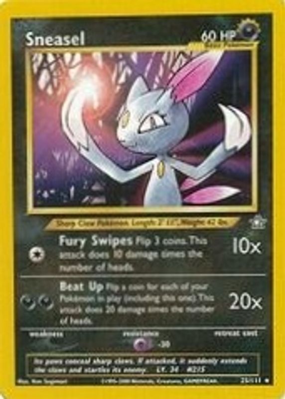 The Sneasel 2000 Neo Genesis #25/111 Unlimited card in Raw TCG (Lightly Played) condition has moved up $1.01 (+33.8%) in the last 30 days and was last sold for $4.00 .
