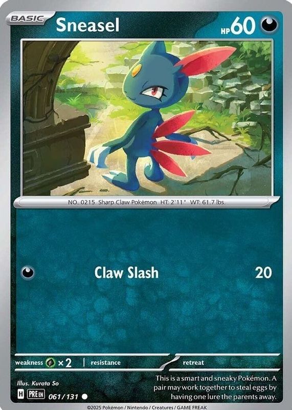 The Sneasel 2025 Scarlet & Violet: Prismatic Evolutions #061/131 Base card in Raw TCG (Near Mint) condition has not changed in price in the last 30 days and was last sold for $0.99 .