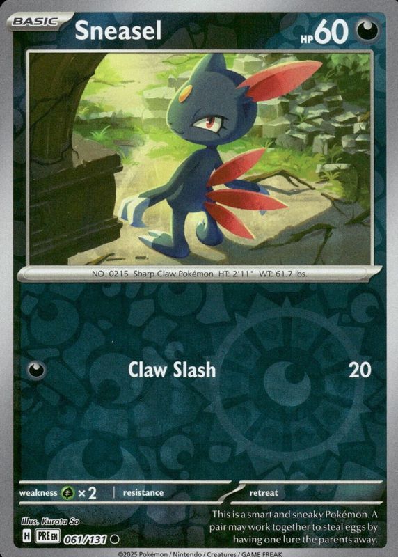 The Sneasel 2025 Scarlet & Violet: Prismatic Evolutions #061/131 Reverse Holo card in Raw TCG (Lightly Played) condition has not changed in price in the last 30 days and was last sold for $2.69 .