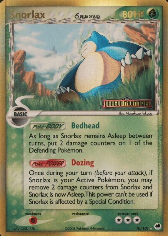 The Snorlax 2006 EX: Dragon Frontiers #010/101 Holo card in Raw TCG (Near Mint) condition has moved down -$20.26 (-29.0%) in the last 30 days and was last sold for $49.50 .