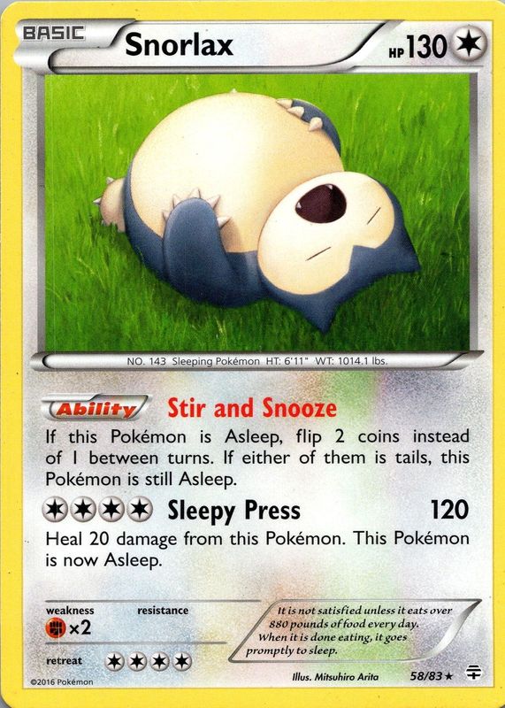 The Snorlax 2016 XY: Generations #58/83 Base card in Raw TCG (Lightly Played) condition has moved up $0.49 (+19.6%) in the last 30 days and was last sold for $2.99 .