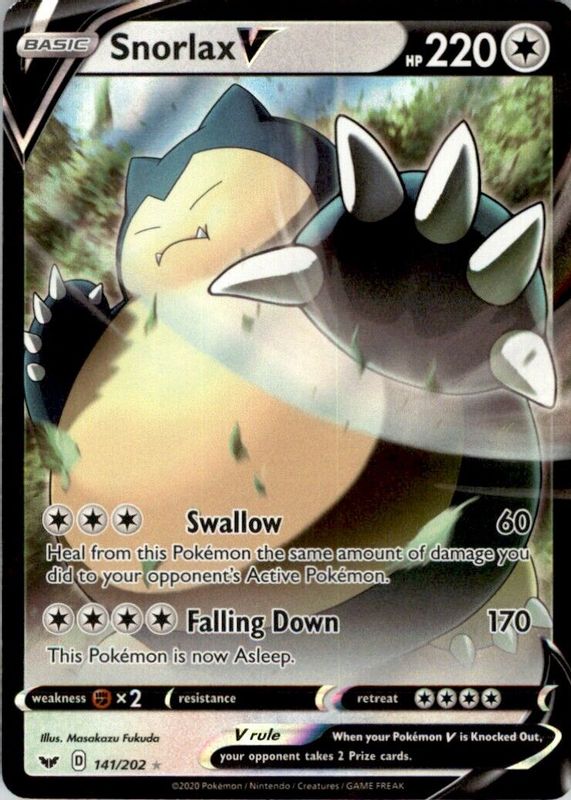 The Snorlax V 2020 Sword & Shield #141/202 Holo card in Raw TCG (Near Mint) condition has moved down -$1.06 (-12.4%) in the last 30 days and was last sold for $7.50 .