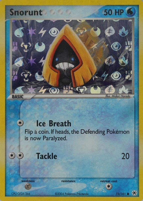 The Snorunt 2004 EX: Hidden Legends #073/101 Base card in Raw TCG (Near Mint) condition has moved down -$1.29 (-54.2%) in the last 30 days and was last sold for $1.09 .