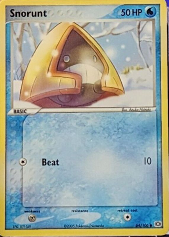 The Snorunt 2005 EX: Emerald #064/106 Base card in Raw TCG (Near Mint) condition has moved up $9.01 (+910%) in the last 30 days and was last sold for $10.00 .