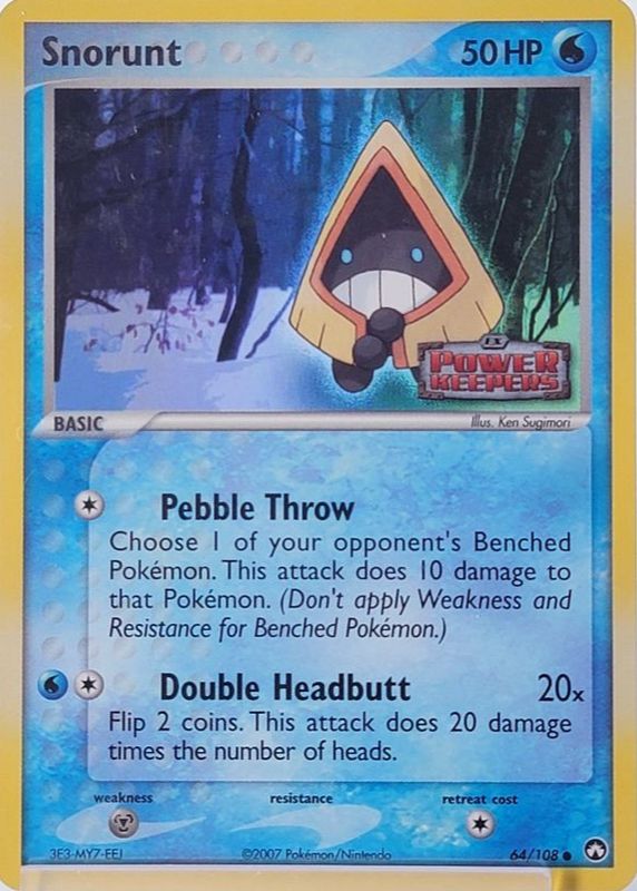 The Snorunt 2007 EX: Power Keepers #064/108 Base card in Raw TCG (Lightly Played) condition has moved down -$0.05 (-1.9%) in the last 30 days and was last sold for $2.54 .