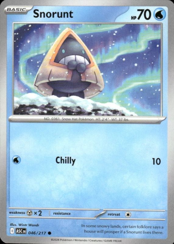 The Snorunt 2026 Mega Evolution: Ascended Heroes #46/217 Base card in Raw TCG (Near Mint) condition has moved up $0.36 (+31.9%) in the last 30 days and was last sold for $1.49 .