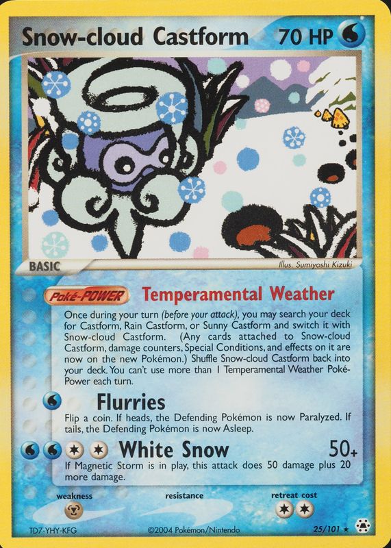 The Snow-Cloud Castform 2004 EX: Hidden Legends #025/101 Base card in Raw TCG (Near Mint) condition has not changed in price in the last 30 days and was last sold for $1.39 .
