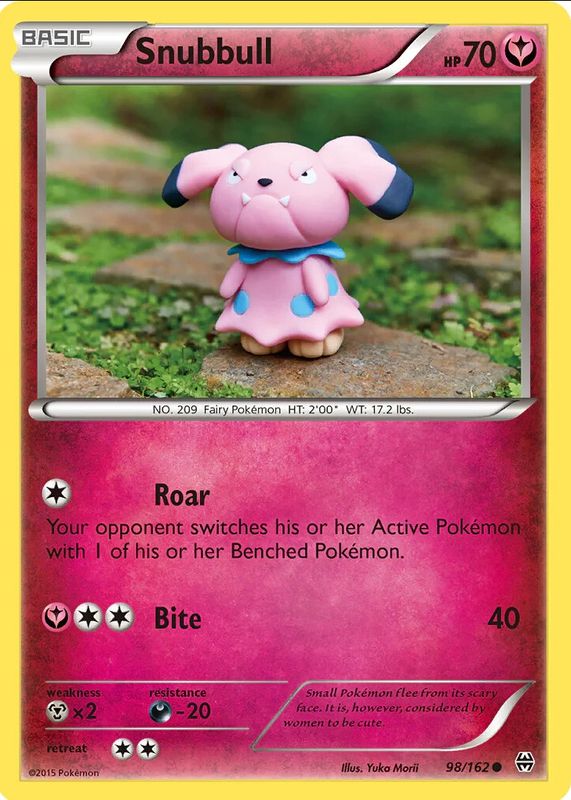 The Snubbull 2015 XY: BREAKthrough #098/162 Base card in Raw TCG (Lightly Played) condition has moved up $0.07 (+3.6%) in the last 30 days and was last sold for $2.00 .