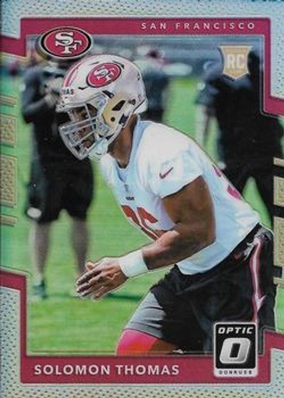 The Solomon Thomas 2017 Optic #116 Holo Rookie card is 1 of 26 Solomon Thomas' card variations in the 2017 Optic set being tracked by Sports Card Investor, including Base, Bronze, Lime, Pink, and Red & Yellow.