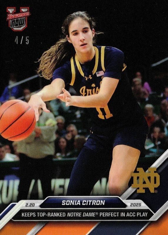 This card is 1 of 6 Sonia Citron's card variations in the 2024 Bowman U Now set being tracked by Sports Card Investor, including Base (Print Run: 629), Blue /49, Purple /25, Red /10, and Gold /1.