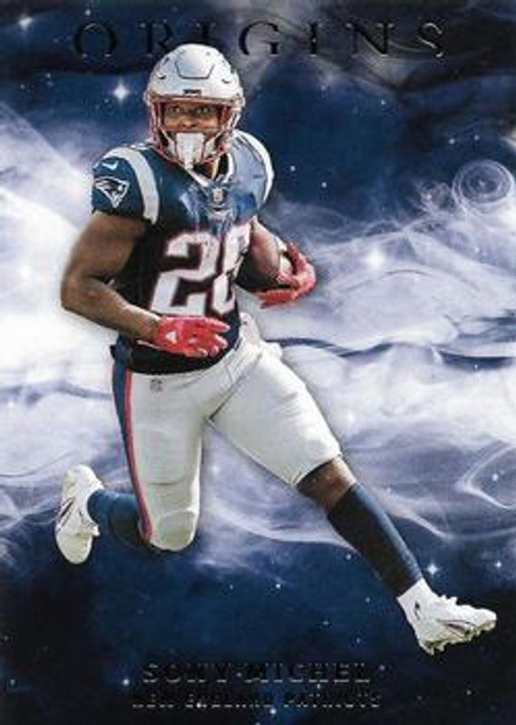 The Sony Michel 2019 Origins #59 Base card is 1 of 17 Sony Michel's card variations in the 2019 Origins set being tracked by Sports Card Investor, including Red /299, Orange /175, Blue /99, Turquoise /25, and FOTL Purple /13.