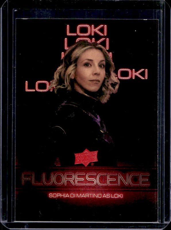 The Sophia Di Martino as Sylvie 2024 Upper Deck Marvel Studios Series 1 #F-5 Flourescence - Red card is 1 of 40 Sophia Di Martino as Sylvie's card variations in the 2024 Upper Deck Marvel Studios Series 1 set being tracked by Sports Card Investor, including 1995 Collectors Choice SE Retros, Dazzlers - Blue, Dazzlers - Green, Dazzlers - Pink, and HoloGrFx.