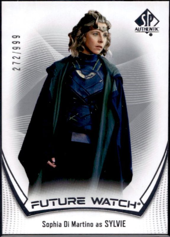 The Sophia Di Martino as Sylvie 2024 Upper Deck Marvel Studios Series 1 #FW-4 SP Authentic Future Watch Retros /999 card is 1 of 40 Sophia Di Martino as Sylvie's card variations in the 2024 Upper Deck Marvel Studios Series 1 set being tracked by Sports Card Investor, including 1995 Collectors Choice SE Retros, Dazzlers - Blue, Dazzlers - Green, Dazzlers - Pink, and Flourescence - Red.